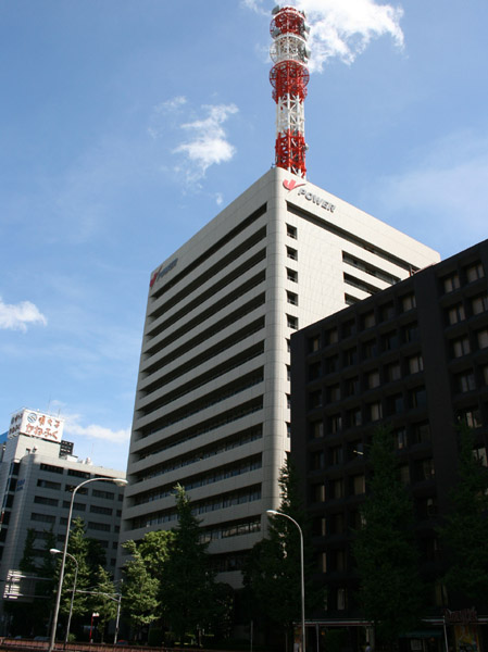銀座に立つ電源開発本社ビル。全国で発電事業をしている会社で、事業に関係があるのか、屋上に大きな塔が立っているのが特徴的。