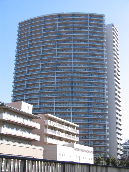 目黒川のほとりにある高層マンション。31階建て、109m。