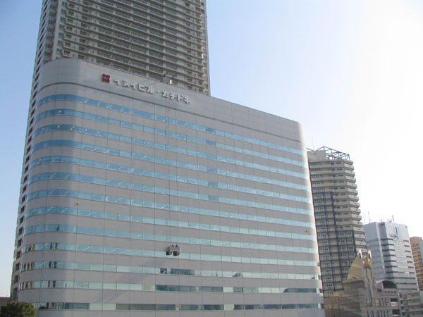 勝どき橋そばに建つ横長のビル。窓ふきゴンドラが小さく見える。