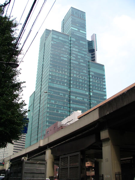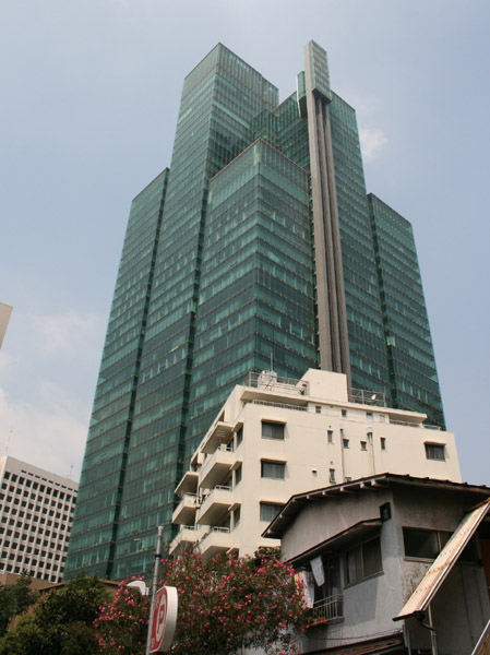 六本木の高層ビル群の中で、少し異色なのがこのビル。緑ガラスのブロックを積み重ねたようなデザイン。