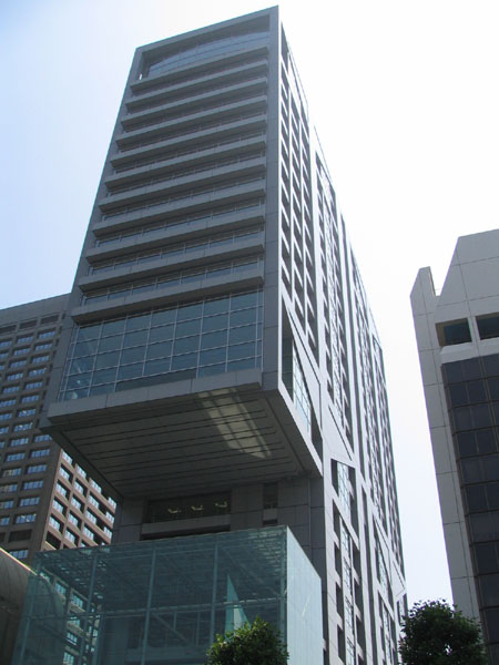 日比谷公園前、道路に横向きで変わった形のビルが新生銀行。