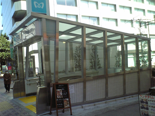 入り口の上に金属の支柱と透明・半透明の壁と屋根が付いている。やや都会的だが、コンパクトでもある。