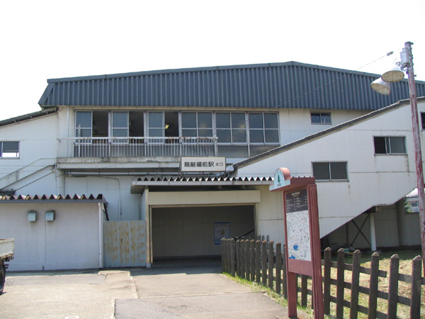 競艇場の最寄り駅だが、駅舎はあまり駅らしくない地味なもの。競艇場へ続くスカイウォークがのびている。