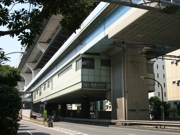 駅舎は、ゆりかもめの他の駅と同じだが、上に首都高速道路台場線がのしかかっているため、あまり駅らしく見えない。