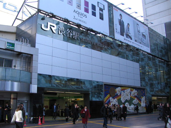 | 渋谷駅は、大ターミナルで、デパートの入った駅ビルなどもあり、各改札口で駅舎の形が違う。 メディアなどでもよく出てくることで有名なのが、大交差点やハチ公前に位置するJRハチ公口付近(上の画像) | ||