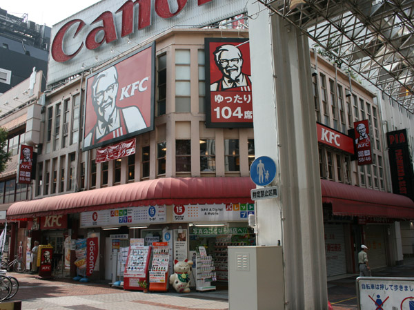 ケンタッキーのおじさんがデカデカとありますが、ビル自体はかなり古めです。縦長の窓がたくさんあります。