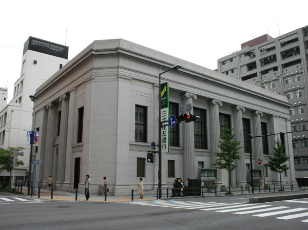 最上部がくるっと巻いているイオニア式の柱が並んでる、典型的な銀行建築。