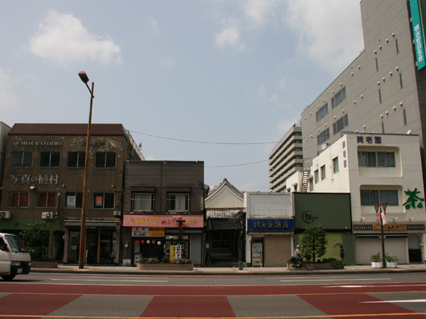 橘通1丁目西側。植村写真館、奥の和風建築、簡素だが看板建築風のお店、右端は昭和40年代を想像させる壁面のへこんだ変わった窓枠のビル。