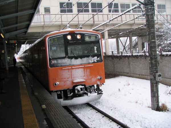 | 雪の201系。2005年冬、西立川駅で。 |