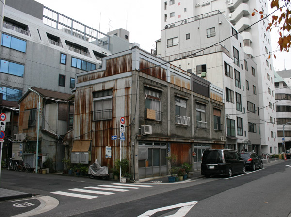 4軒同じ構造になってます。側面と上部はトタンでしょうか、金属壁です。3番目の店舗だけ上の部分もモルタルです。非常に面白い建物です。