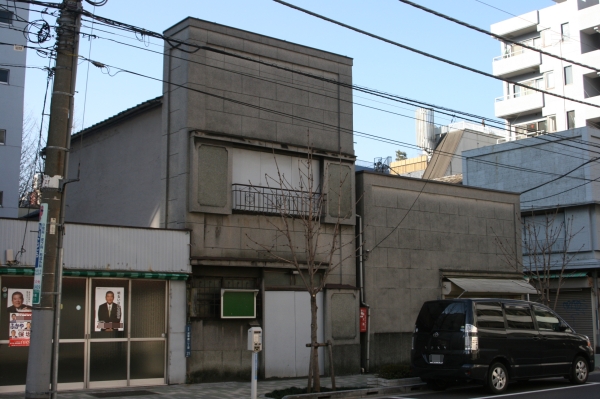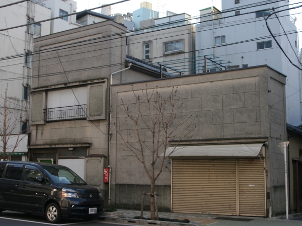 看板建築風モルタル壁の後ろに和風の母屋の屋根が少し見えています。
