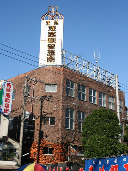 浅草寺そばに立つ温泉のビル。昭和32年オープンです。建物がいい感じに古くなってます。
