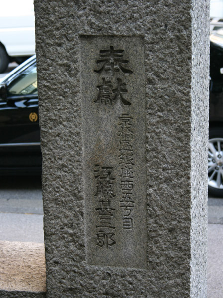 これは、日枝神社の男坂の鳥居の脇の柵で、奉納者の住所として「京橋区銀座西五丁目」とあります。