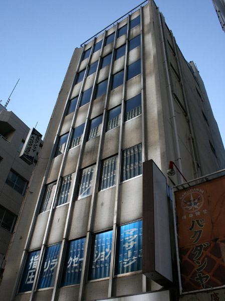 並木橋そばの交差点角に立つ昭和風ビル。解体するためか、すでに空きビルになってました。