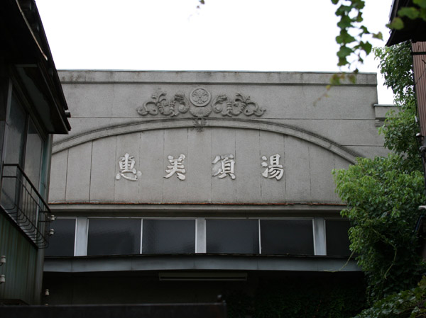 正面壁のレリーフも凝ってます。字体は左から書かれているので戦後でしょうが、なかなかノスタルジック。