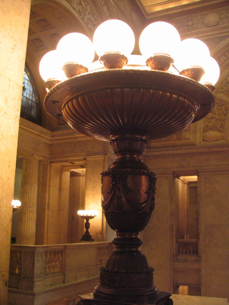 中央広間の階上を照らす明かり。見事な装飾に並んだ電球がおもしろい。