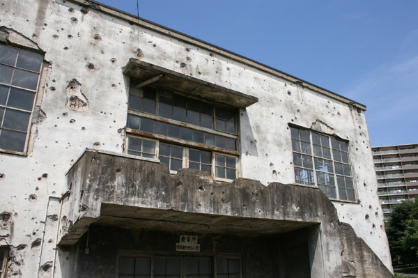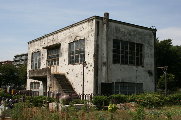 東大和市の東大和南公園内に残る戦前の日立航空機変電所。戦時中の機銃掃射の痕跡で穴だらけです。