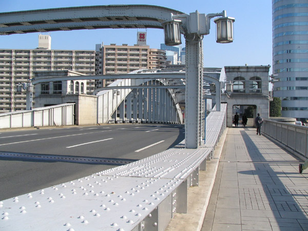 隅田川に架かる跳開橋の勝どき橋。真ん中が、船が通るときに上に開く構造になってます。
