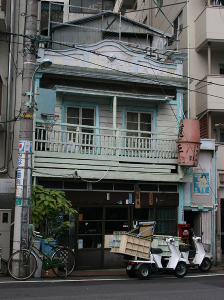 下見板の木造建築ですが、2階上の部分のデザインはまさに看板建築です。モダンですね。