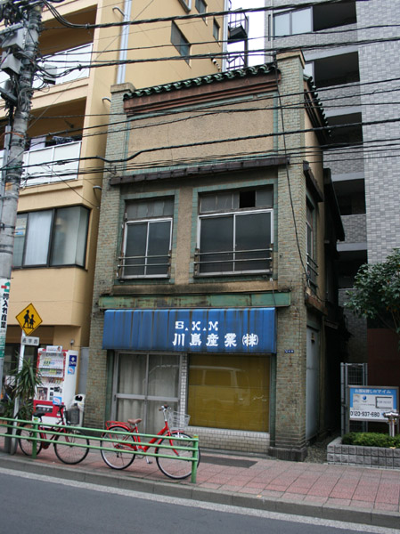 中央区新富町の通り沿いにあった商店建築。看板建築とは少し違い、瓦屋根付の和洋折衷タイプです。