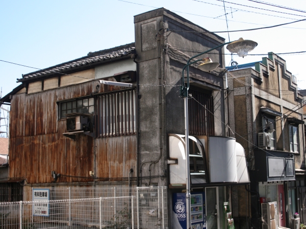 駒場で見かけた2棟の看板建築。和風建築の表側にやや凝ったモルタルの壁が立っている典型的な看板建築です。