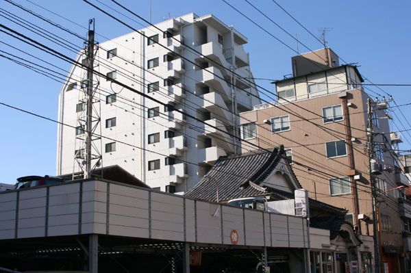 遠景。周辺は住宅やマンションが建ち並んでいます。