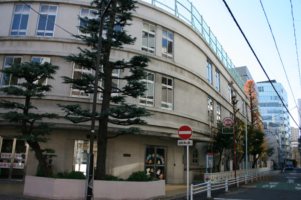 中央区新川にある小学校。昭和2年建築。曲面のデザインが復興小学校のものと共通しています。