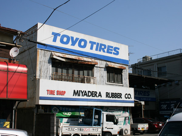 青梅市内のタイヤ店。整備工場っぽい建物、トタン風の壁、後ろに少し見える木造部分。