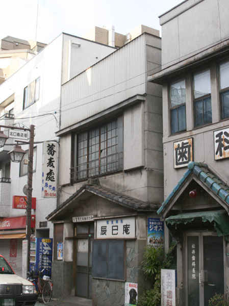 薬局の建物の隣にあるおそば屋さん。モルタルの壁の後ろは和風建築でしょうか。
