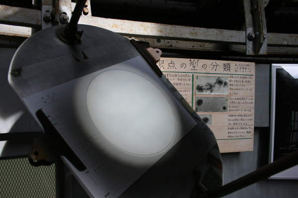 | 黒点観測の様子。望遠鏡を通って映し出される太陽です。 黒点が異常減少したときだったので写っていませんが、この白い部分に黒点が写ります。 |