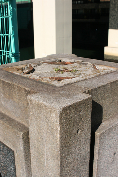 親柱の一つ。灯りの支柱が折れたあとがあります。