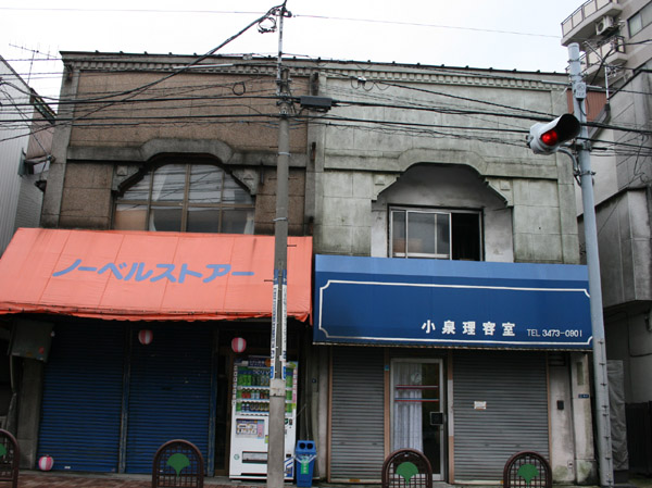 白金6丁目のお店のひとつ。ほぼ同じデザインで左右色の違う看板建築です。
