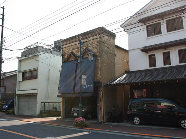 こちらはかなり看板建築的デザインの建物です。構造的にも。青い布で隠してある後ろが気になります。