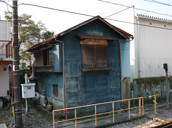 青梅駅に隣接する(あるいは敷地内か)青いトタン壁と思われる建物。