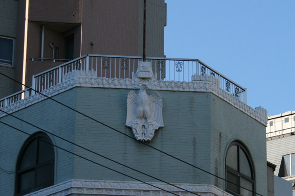 角に面した正面上方には、鷲とみられるシンボルが飾られています。手すりなども凝ってますね。