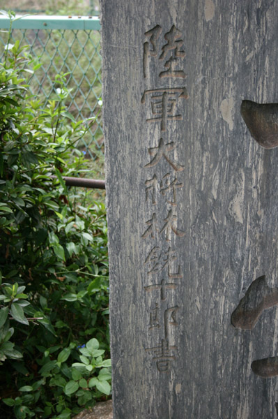 | 陸軍大将林銑十郎の銘が。33代総理大臣だった人です。 軍事拡大政策を行ったのであまり評価は良くありません。どういう謂われでこれを作ったのかは不明です。 そう言ったこともあってか、この碑に対する批判もあるようで、撤去すべきだという意見もある。 ただ、逆に見れば、過去の負の遺産を撤去して何もかも綺麗さっぱり、というのは良くないでしょう。 戦争に至った歴史を、きちんと説明を付けて保存すべきだと思います。 |