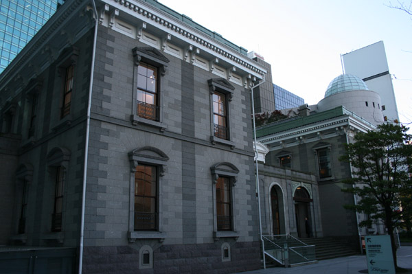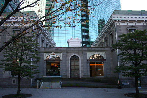 明治5年に開業した旧新橋駅の跡地に出来た初代駅舎を模した建物。この下に史跡「旧新橋停車場跡」遺構が眠っている。