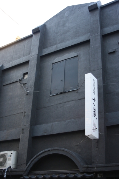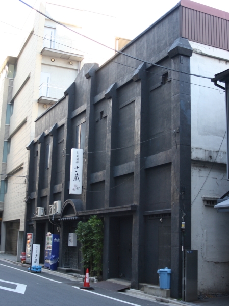 日本橋川沿いにある店舗で、外観が倉庫のような建物を改装したように見えます。