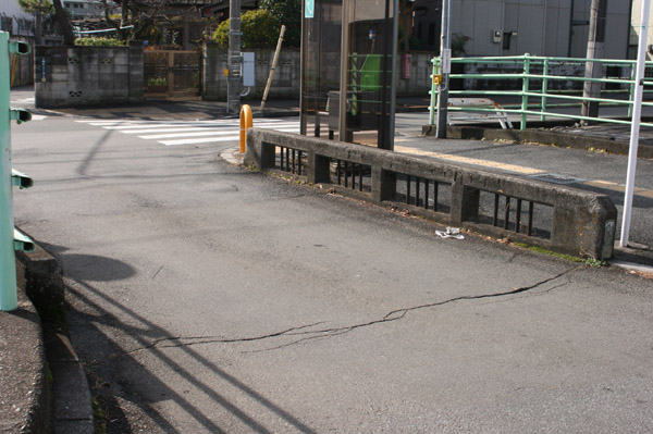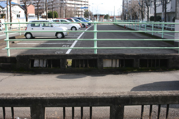 道路の間にある駐車場。おそらくここは元は川で、そこに架かっている橋だったのだろうと思います。