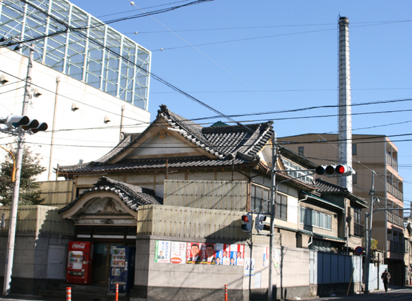 住宅街の交差点角に立つ大きな銭湯。
