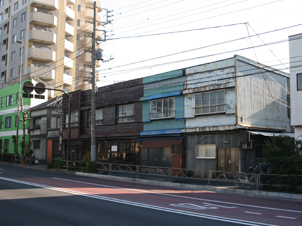 ほぼ同じ構造とデザインの木造2階建て店舗が街道沿いに並んでいます。まとめて建築されたのでしょう。