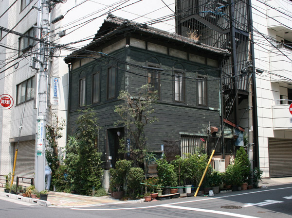 東上野のマンションや雑居ビルの建つ一角で見かけた古い民家です。黒い木造の壁が非常に特徴的。窓枠も見事。