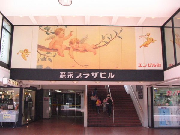 ビルの下のエンゼル街。天使の絵が掲げられてます。