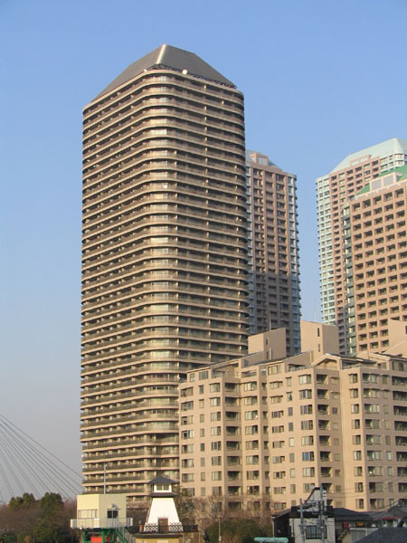佃島の北端大川端リバーシティの高層マンション群の一つ。132m、40階。