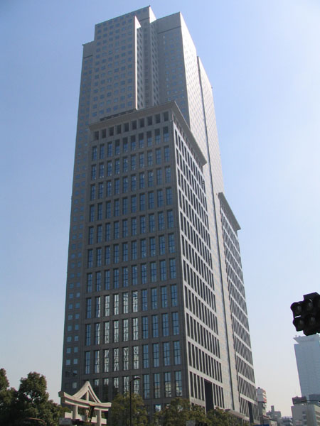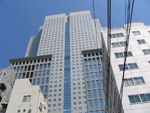 | ビル正面側。低層ビル越しに見た図です。194.45m、44階建て。高い。 ちなみに、あまり知られてないけど、NTTドコモ本社ビルです。 (ふつうドコモ系のビルはドコモの名前が付いているが、本社ビルは自社所有ではないため)。 |