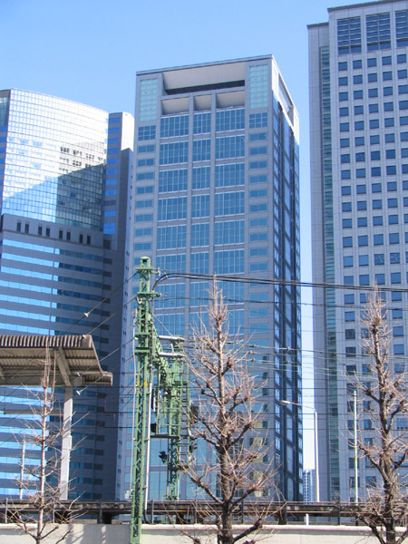ビル群の間に挟まれてこぢんまりとした感のある高層ビル。150m、30階建て。