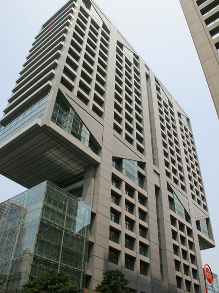 日比谷公園前、道路に横向きで変わった形のビルが新生銀行。