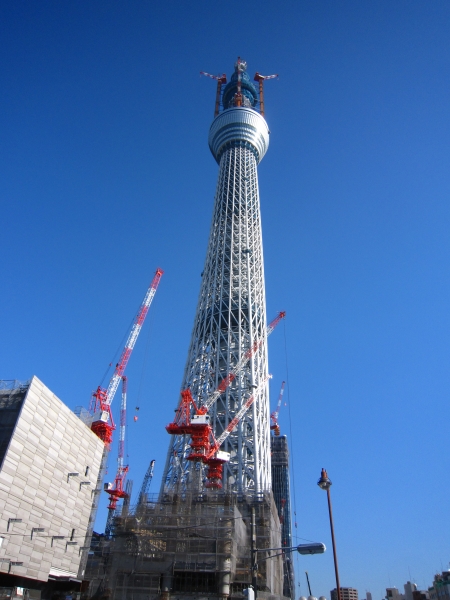 完成前から話題の超高層通信塔スカイツリーです。完成すれば高さは634m、電波塔では世界一になる予定。