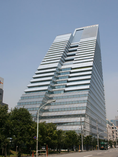 横から見ると三角がよくわかる。カネボウのロゴも入ってます。23階建て94.6m。