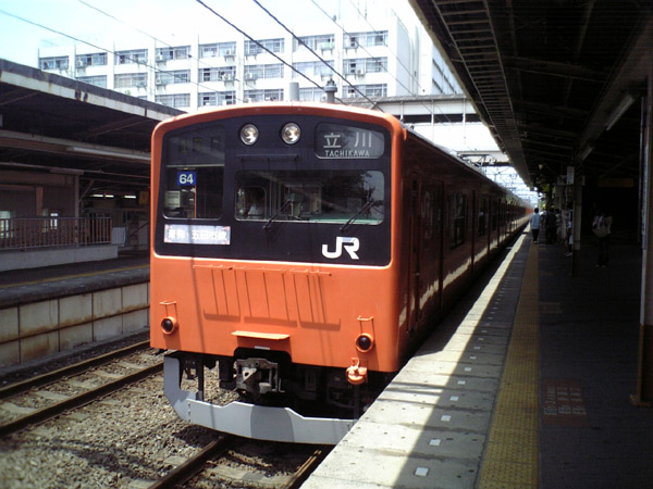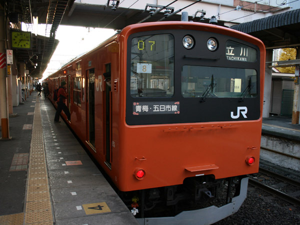 | 立川行きの青梅線4両編成。青梅駅で運行を分けたため、立川−青梅間で4両編成自体ほとんどなくなりましたが、その201系です。 |